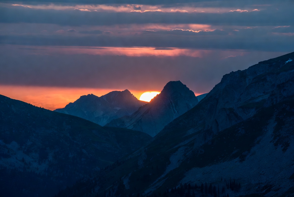 alpine landscape, clouds, dramatic sky, dusk, evening light, golden hour, horizon, jagged mountains, landscape photography, mountain range, mountains, nature, orange sky, outdoor, purple hues, rocky peaks, scenery, silhouettes, sky, snow capped, snowy peaks, sun, valley, wilderness, sunset