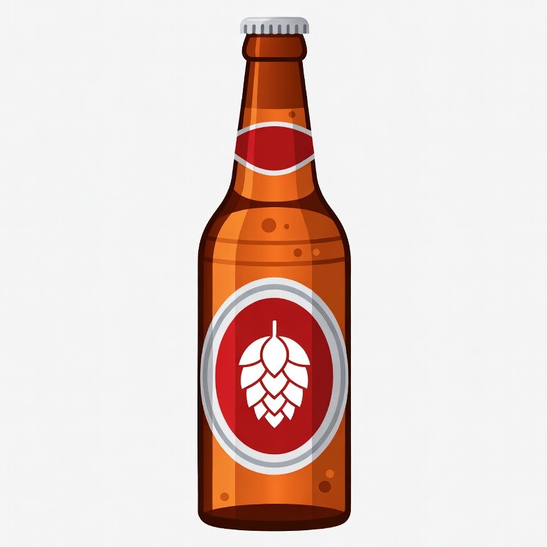 A clipart illustration of a brown glass beer bottle with a silver cap on a white background. The bottle features a red circular label with a white hops icon in the center. It has a classic long-neck design and subtle highlights for a glossy appearance.