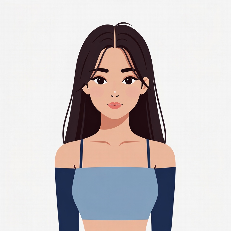 anime style, blue top, blush, cartoon woman, crop top, digital illustration, fashion illustration, female, headshot, illustration, isolated background, kawaii, large eyes, long black hair, off-shoulder top, portrait, pretty woman, simple background, smiling, straight hair, vector art, woman, young woman, Asian woman