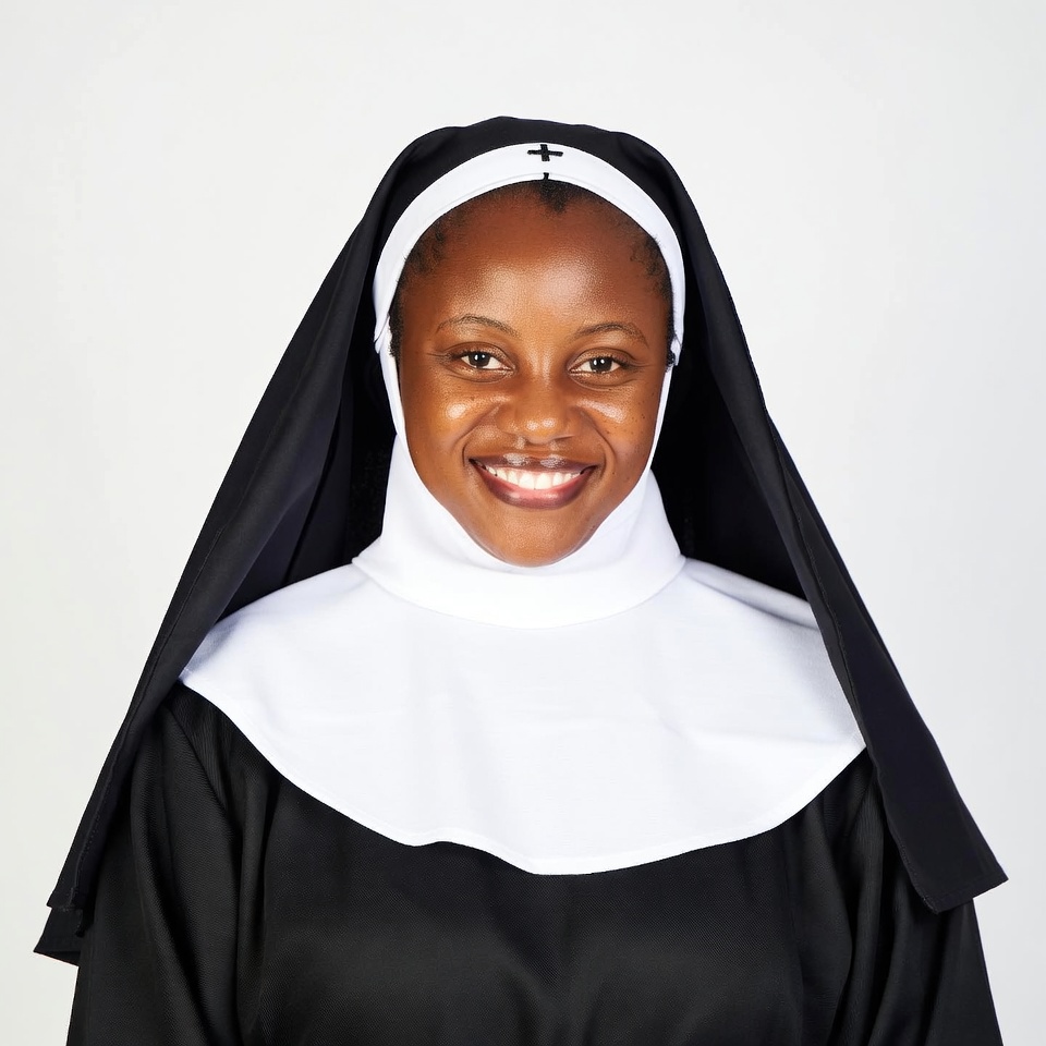 An African-American woman dressed as a nun smiles warmly at the camera. She wears a traditional black habit with a white wimple and coif, and a black veil with a cross. The portrait is set against a plain white background.