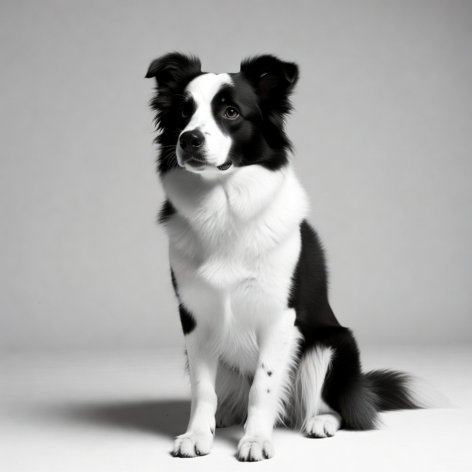 A black and white Border Collie dog sits attentively on a plain gray background. The dog has perky ears, a fluffy coat with distinctive markings, and a bushy tail curled around its paws. Its bright eyes gaze slightly upward.