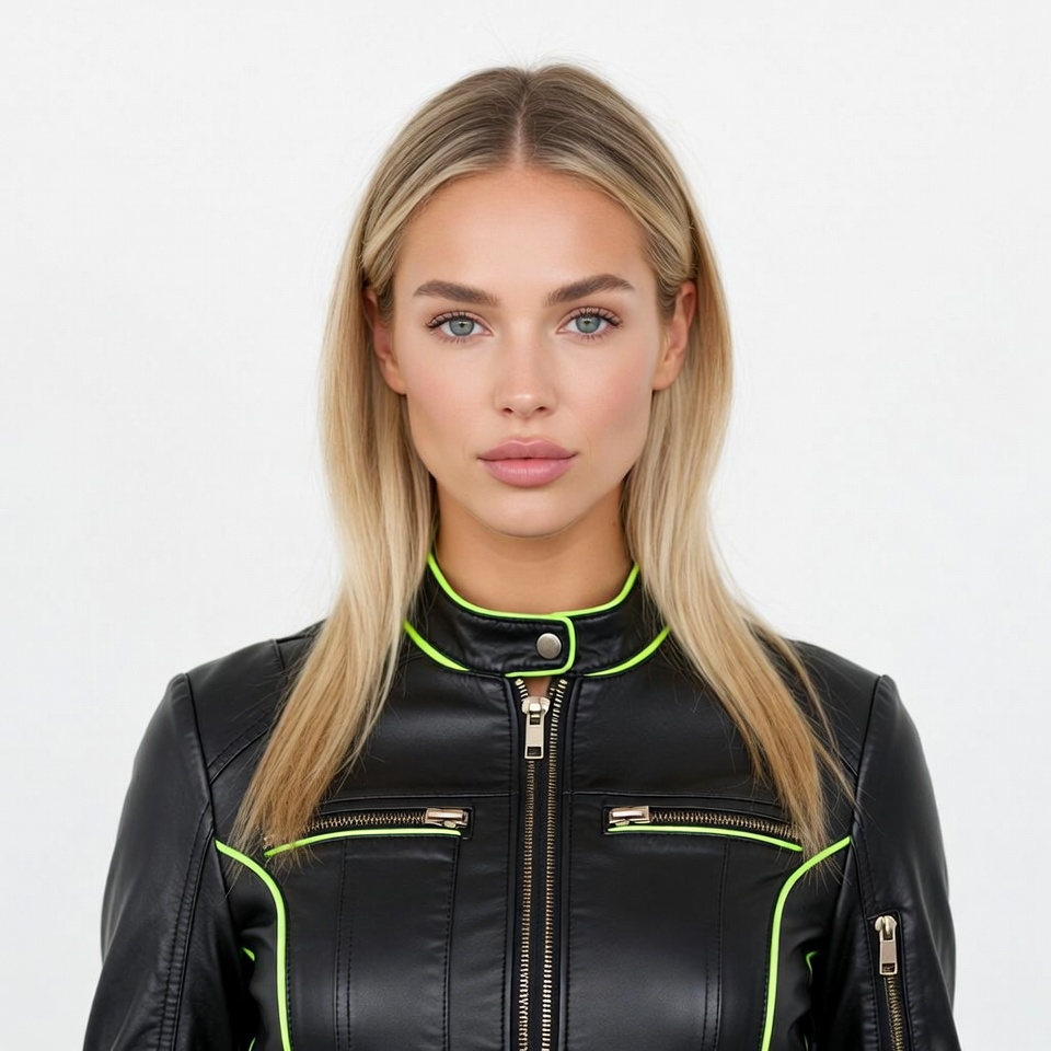 A young woman with long blonde hair and blue eyes faces forward against a white background. She wears a shiny black leather jacket with neon green trim and multiple zippers. Her expression is neutral with full lips slightly parted.