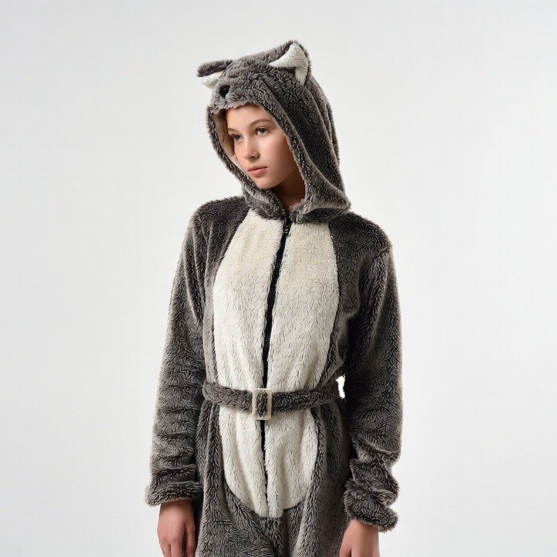 White, animal hoodie, belt, costume, cute costume, female, fluffy onesie, full body, furry costume, gray onesie, gray wolf, hood, kigurumi, onesie, pajamas, standing, white background, wolf costume, wolf ears, wolf hood, wolf onesie, young girl, girl