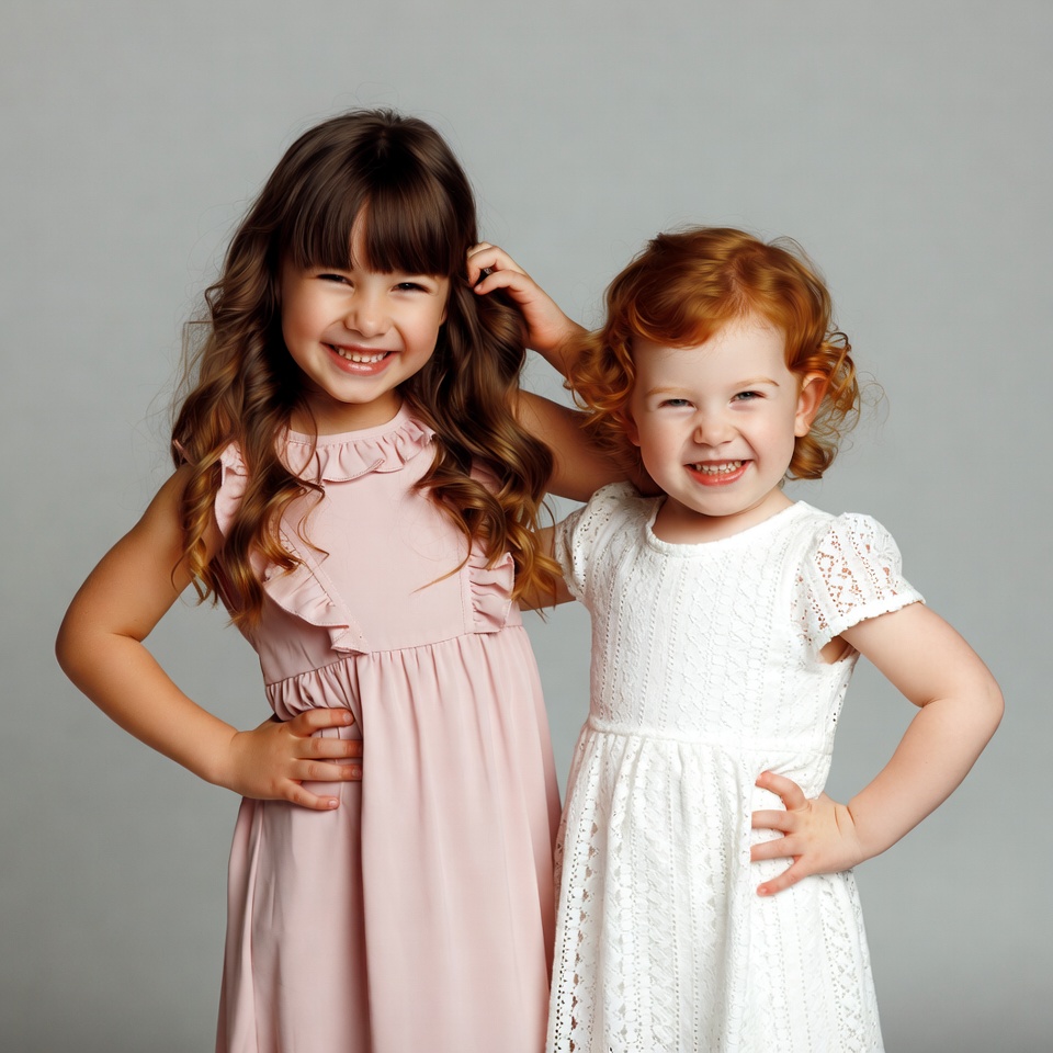White, bangs, brown hair, curly hair, female, gray background, hands on hips, lace dress, pink dress, red hair, ruffled dress, smiling girls, studio photo, two girls, white dress, young girls, girls
