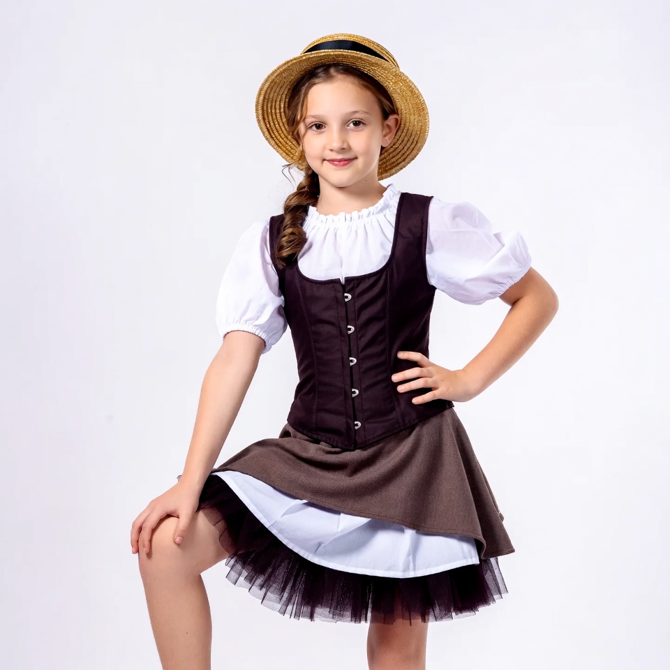 A young White girl with freckles and blonde braids wears a traditional Bavarian dirndl outfit. She has a wide-brim straw hat, white puffed-sleeve blouse, brown corset vest, and layered skirt with white and black tulle petticoat. She poses confidently with one hand on her hip against a plain white background.