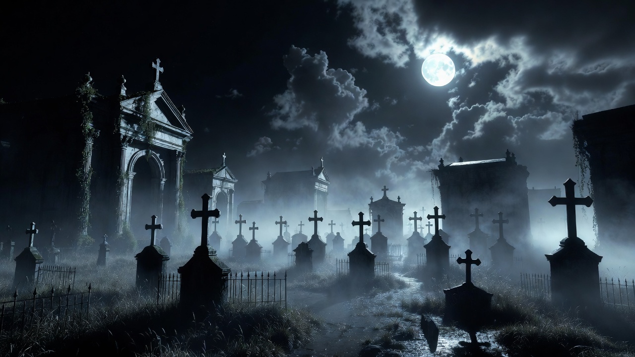 A dark cemetery scene features numerous stone crosses and ornate mausoleums shrouded in thick fog. A full moon illuminates the cloudy night sky above the tombstones and arched gateways. A winding path leads through the misty graveyard with overgrown grass.