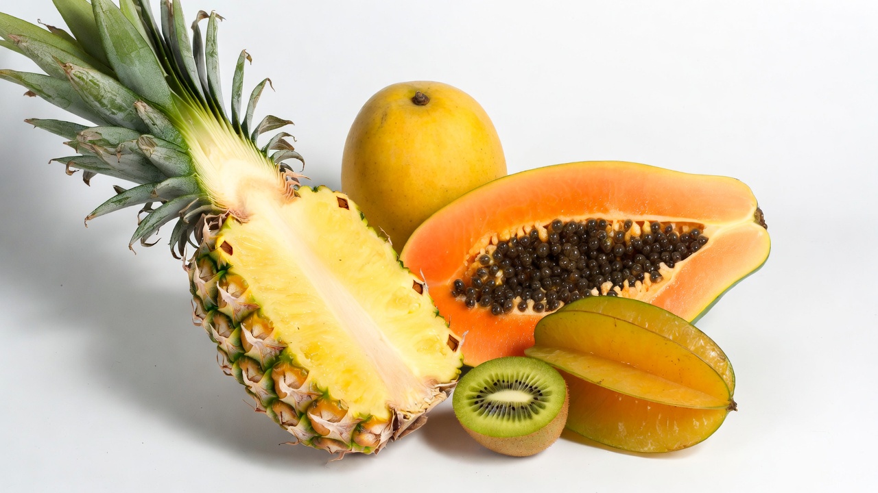exotic fruits, fresh fruit, fruit arrangement, fruit display, fruit slices, green kiwi, halved fruits, juicy pineapple, kiwi, mango, orange papaya, papaya, sliced papaya, sliced pineapple, starfruit, tropical fruits, white background, yellow mango, yellow pineapple, pineapple