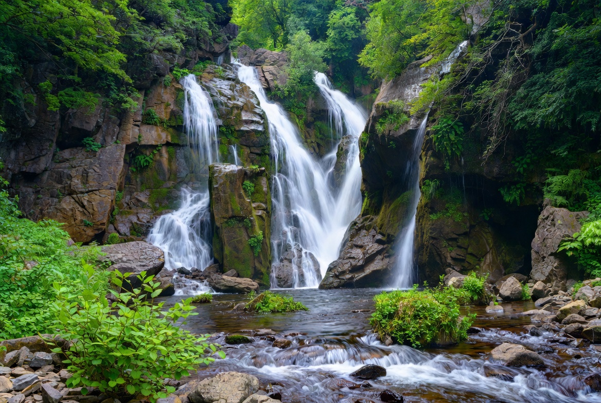 A tall multi-tiered waterfall cascades down rocky cliffs surrounded by dense green forest. Water flows into a rocky stream at the base with lush vegetation on both sides. The scene features vibrant greenery and mist from the falling water.