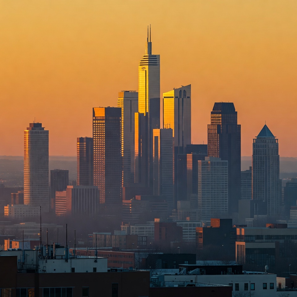 A modern city skyline features tall skyscrapers silhouetted against a vibrant orange sunset sky. Prominent high-rise buildings with unique angular designs glow in the golden light. The scene includes various mid-rise structures and a hazy foreground.