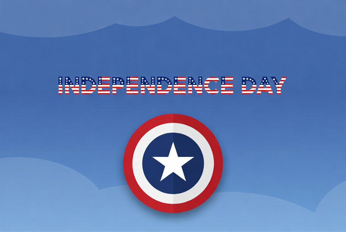 A vibrant illustration features the text 'Independence Day' in bold red, white, and blue letters against a blue sky with white clouds. Below the text sits a prominent red, white, and blue Captain America-style shield with a white star in the center. The design uses patriotic colors and a clean, isolated background.