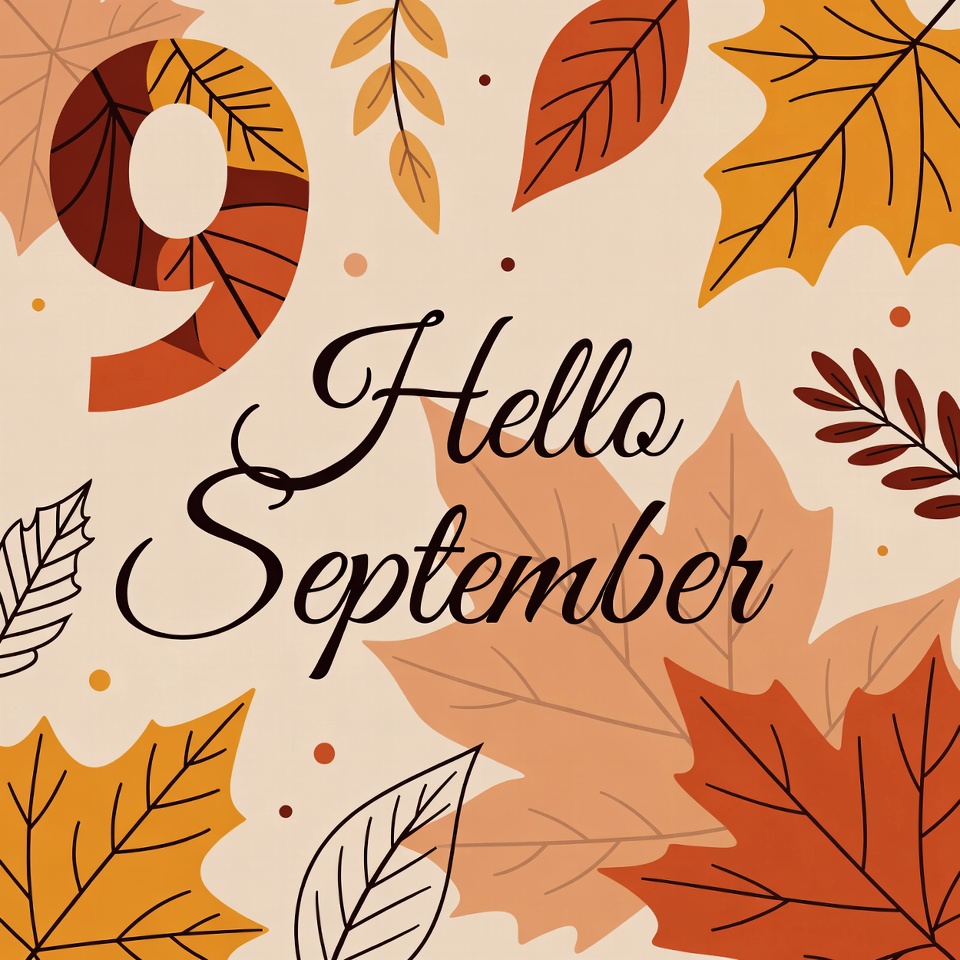 A colorful illustration features the number 9 made of layered autumn leaves in shades of orange and yellow. Elegant black text reads 'Hello September' against a beige background scattered with falling leaves and branches. The design captures a festive fall theme with various leaf shapes and subtle dots.