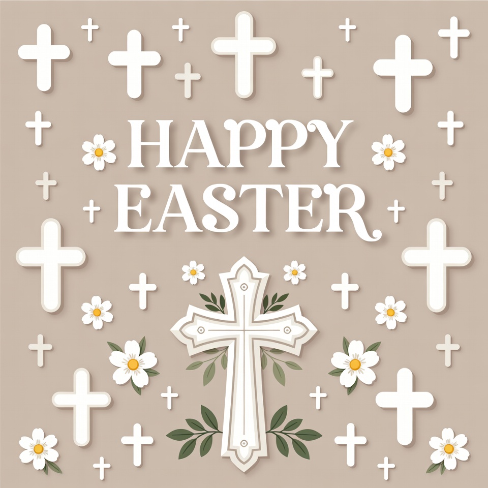 A beige illustration features the text 'Happy Easter' in white elegant font. It is surrounded by numerous white paper-cut style crosses, small white daisies, and green leaves. A large ornate cross with branches sits prominently at the bottom center.