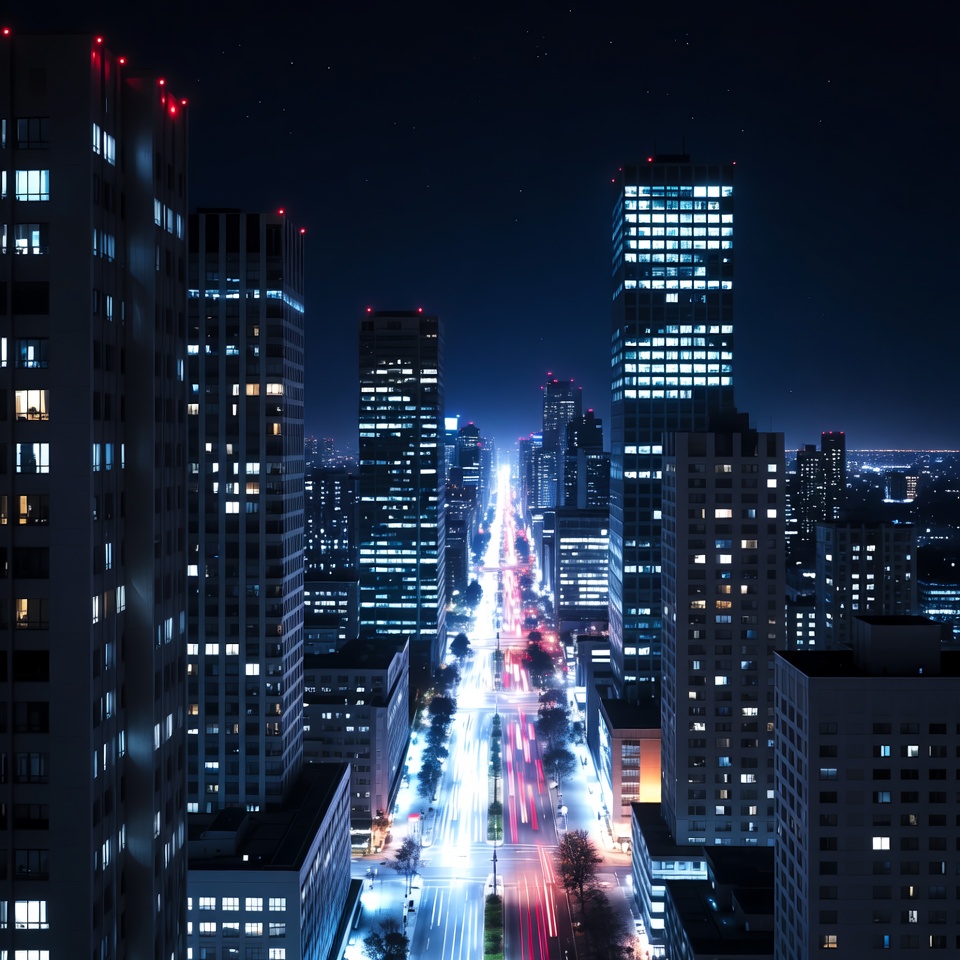 aerial view, boulevard, city lights, cityscape, dark sky, downtown, futuristic city, glowing city, high-rise buildings, highway, illuminated buildings, metropolis, modern city, night city, night view, red lights, skyscrapers, starry sky, street lights, tall buildings, traffic lights, traffic trail, urban landscape, urban night, white lights, city skyline