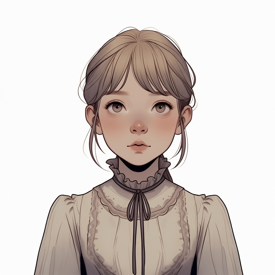 A detailed anime-style illustration of a young woman with light brown hair in loose bangs and a neat updo. She has large expressive eyes and wears a white Victorian-era blouse with ruffled collar and bow tie. The portrait is set against a plain white background.