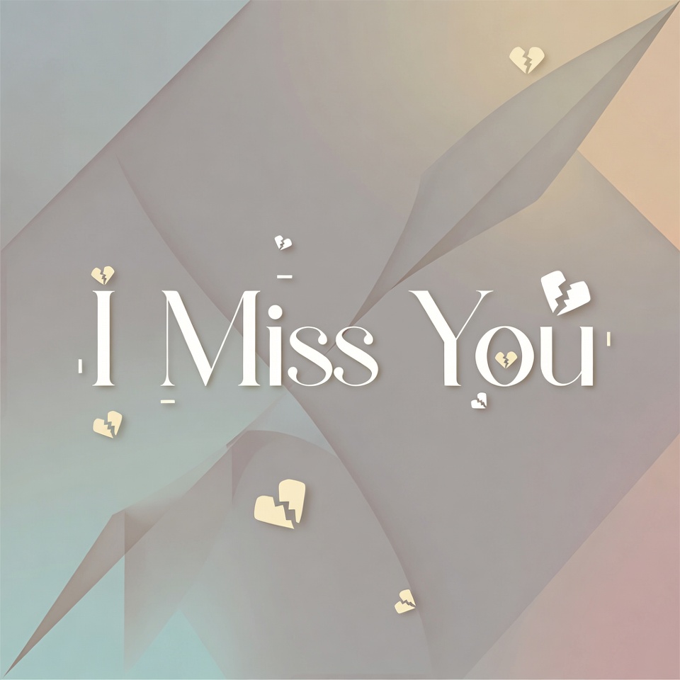 abstract background, beige gradient, broken hearts, digital illustration, emotional design, floating hearts, geometric shapes, gradient background, gray background, heart icons, heartbreak art, love text, miss you, romantic graphic, soft shadows, text art, translucent hearts, valentine graphic, white text, I miss you