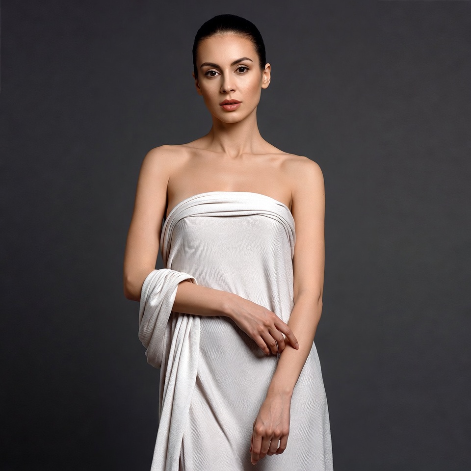White, bare shoulders, beautiful, bun hairstyle, confident gaze, dark hair, elegant, female, gray background, spa towel, standing pose, studio portrait, white towel, wrapped towel, young, woman