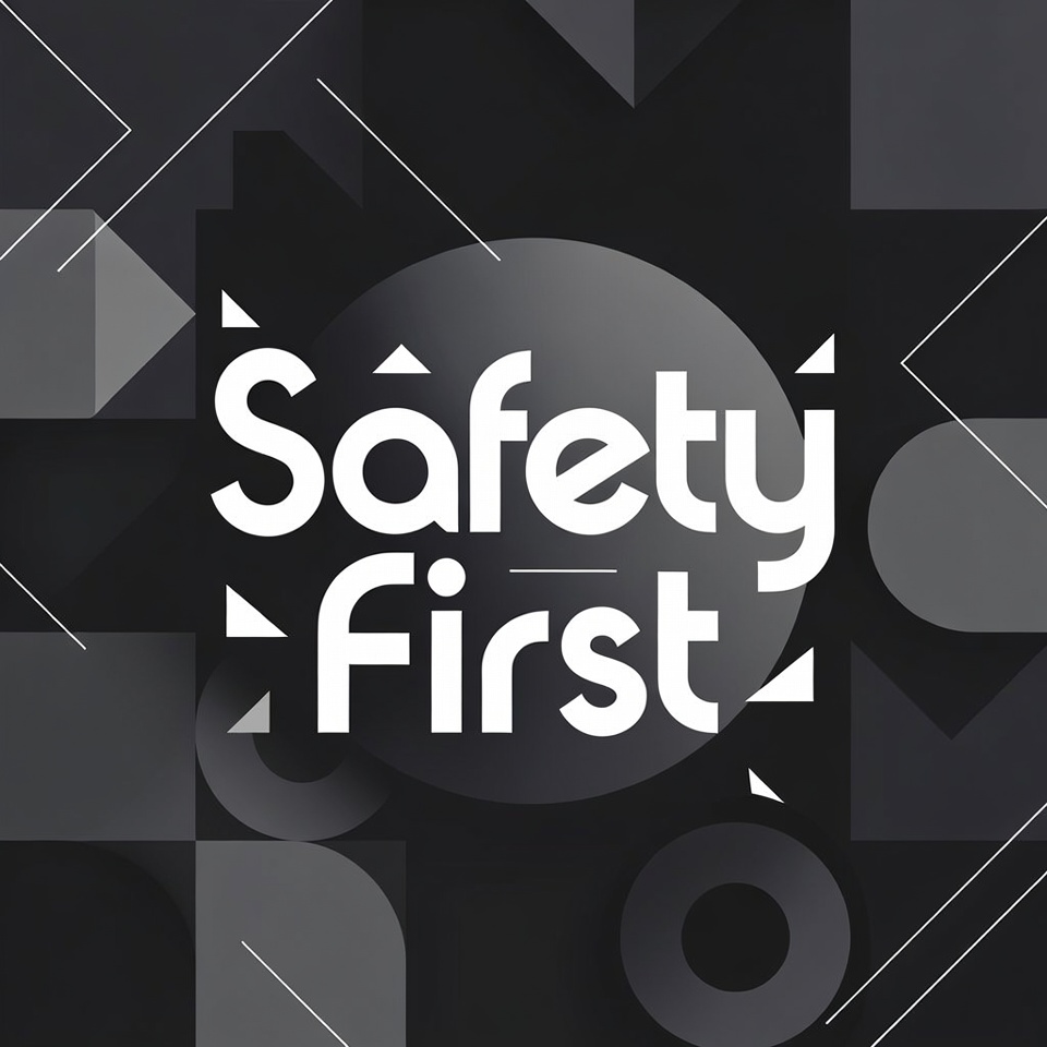 abstract background, black background, bold letters, circles, clipart, geometric shapes, graphic design, illustration, isolated background, modern font, safety, text, triangles, typography, white text, safety first
