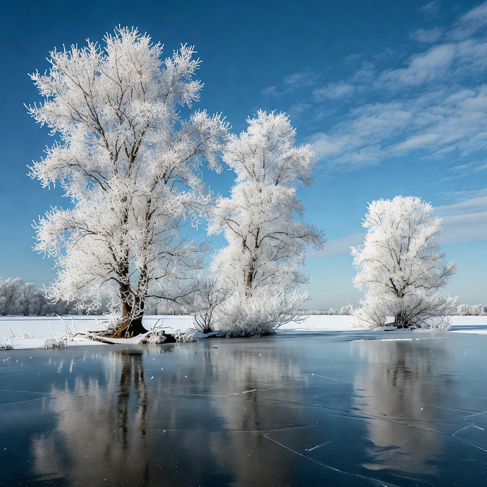 bare trees, blue sky, clouds, cold weather, crisp ice, frost branches, frosty trees, frozen lake, frozen river, ice reflection, icy water, nature, snow-covered trees, snowy field, snowy trees, tree reflections, white frost, winter landscape, winter scenery, winter trees