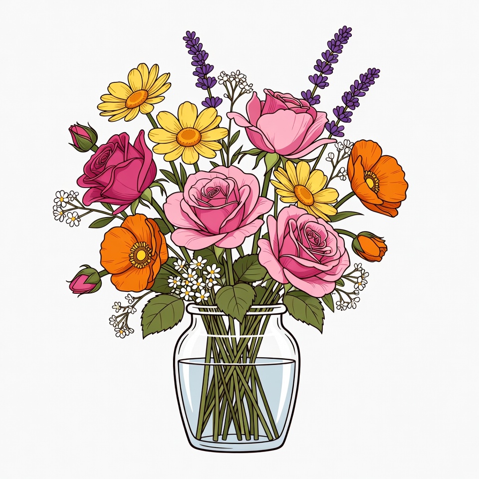 A vibrant bouquet of flowers including pink roses, yellow daisies, orange poppies, and purple lavender is arranged in a clear glass vase. The illustration features detailed stems and leaves with a white background. Various colorful petals and buds add to the lively floral display.