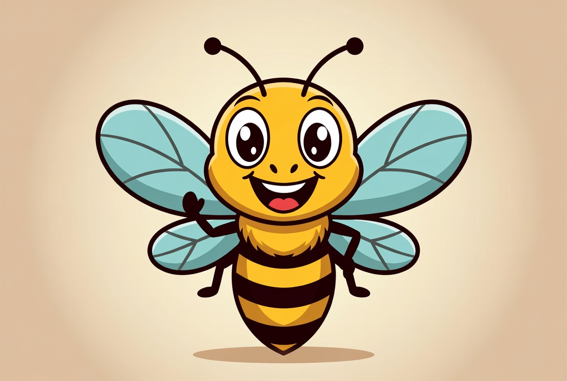 A cute yellow and black cartoon bee with big sparkling eyes and a wide smile waves one arm cheerfully. It has blue wings spread out and stands on a beige background with a subtle shadow. The illustration features bold outlines and vibrant colors.