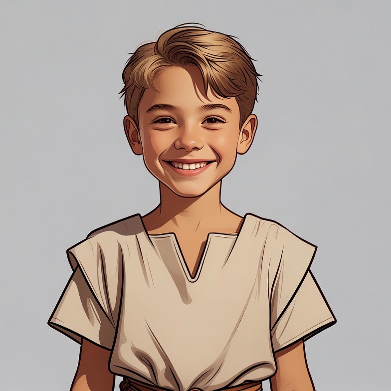 A digital illustration of a young boy with light brown hair smiling happily on a gray background. He wears a beige tunic with a V-neck and short sleeves, cinched with a belt at the waist. The artwork features bold outlines and vibrant shading.