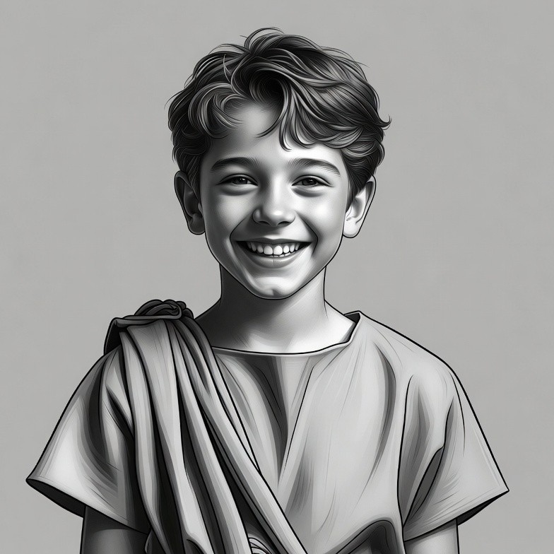 A young boy with curly hair smiles broadly in a detailed grayscale portrait. He wears a draped Roman toga over a simple tunic. The image features a plain gray background.