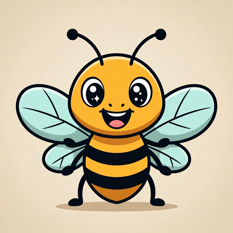 A cheerful cartoon bee with yellow and black stripes stands on a beige background. It has large sparkling eyes, a wide happy smile, and translucent blue wings. The illustration features six legs and antennae in a kawaii style.