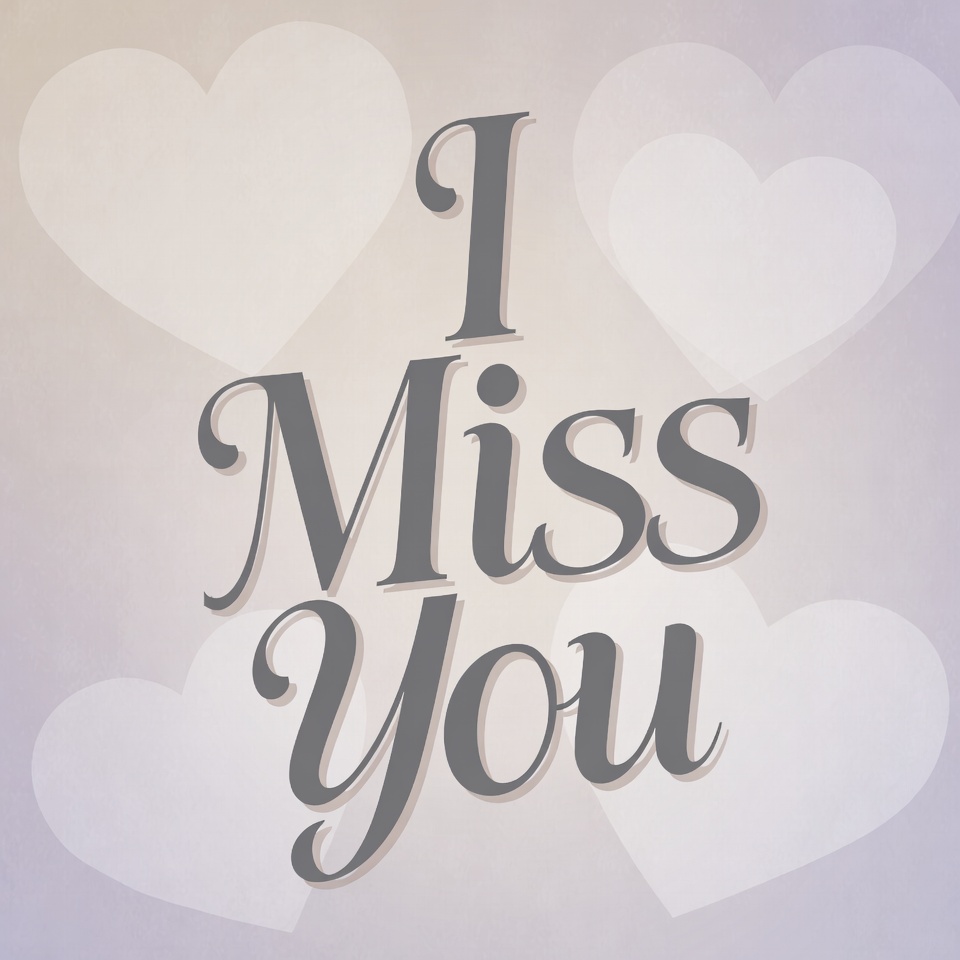 Elegant gray text reads 'I Miss You' in cursive font on a pastel pinkish-purple background. Multiple white heart shapes surround the text. The design features a soft gradient and subtle transparency effects.