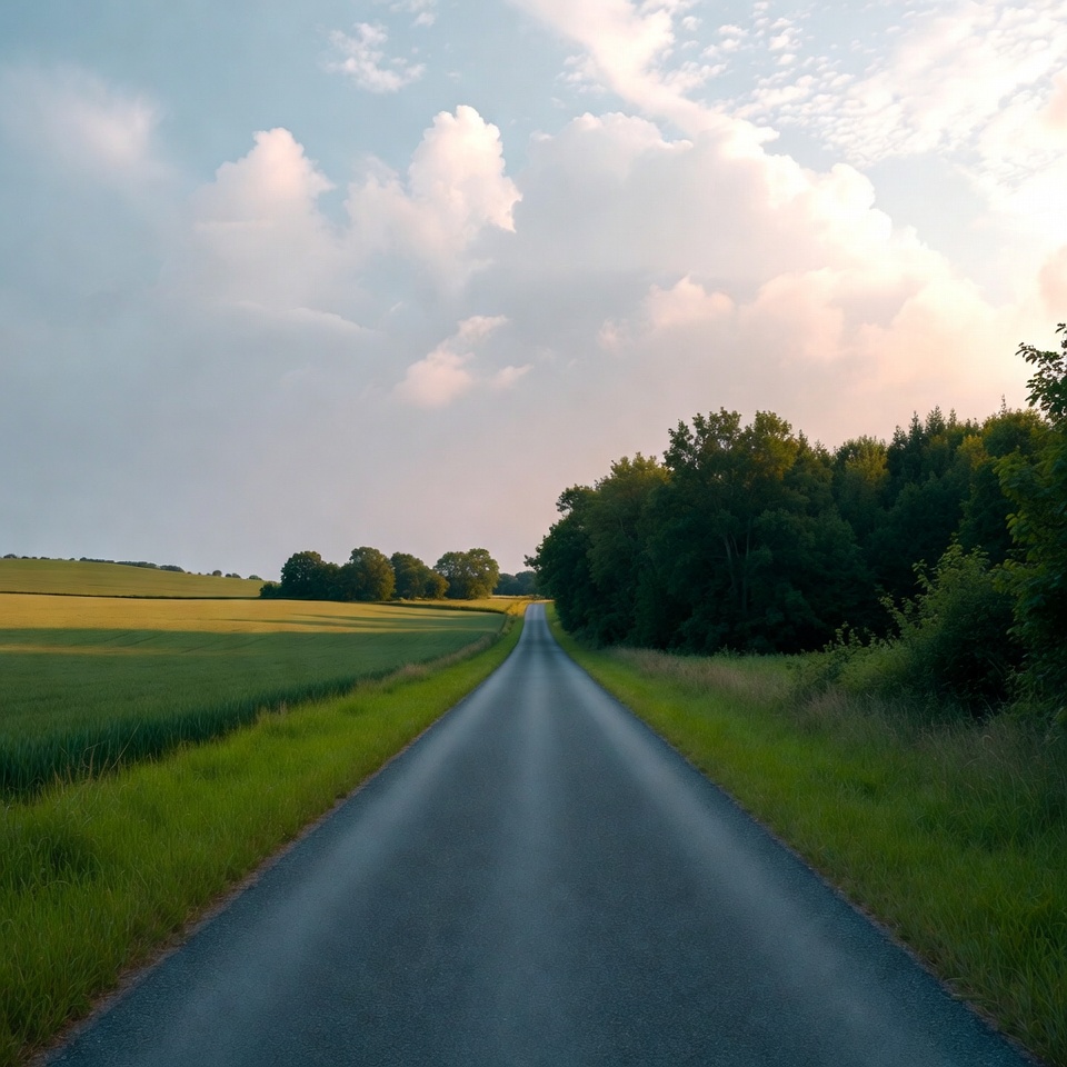 A straight paved road stretches through lush green fields and meadows under a partly cloudy sky. Fluffy white clouds fill the blue sky during golden hour lighting. Dense green trees line both sides of the road in the distance.