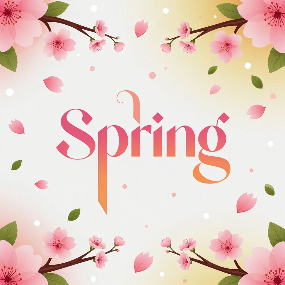 blooming flowers, branches, cherry blossoms, clipart, cursive text, digital art, elegant font, floral border, flower frame, golden glow, green leaves, illustration, isolated background, nature graphic, orange text, petals, pink flowers, pink text, sakura, seasonal design, sparkles, vector graphic, white background, spring