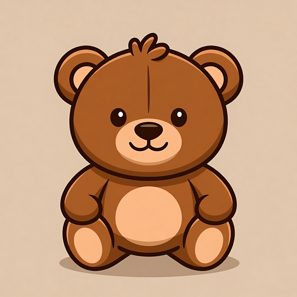 A cute brown teddy bear illustration sits on a plain beige background. The bear has big sparkling eyes, a small smiling mouth, and fluffy fur texture. It features rounded ears, paws, and a plump belly in a kawaii style.