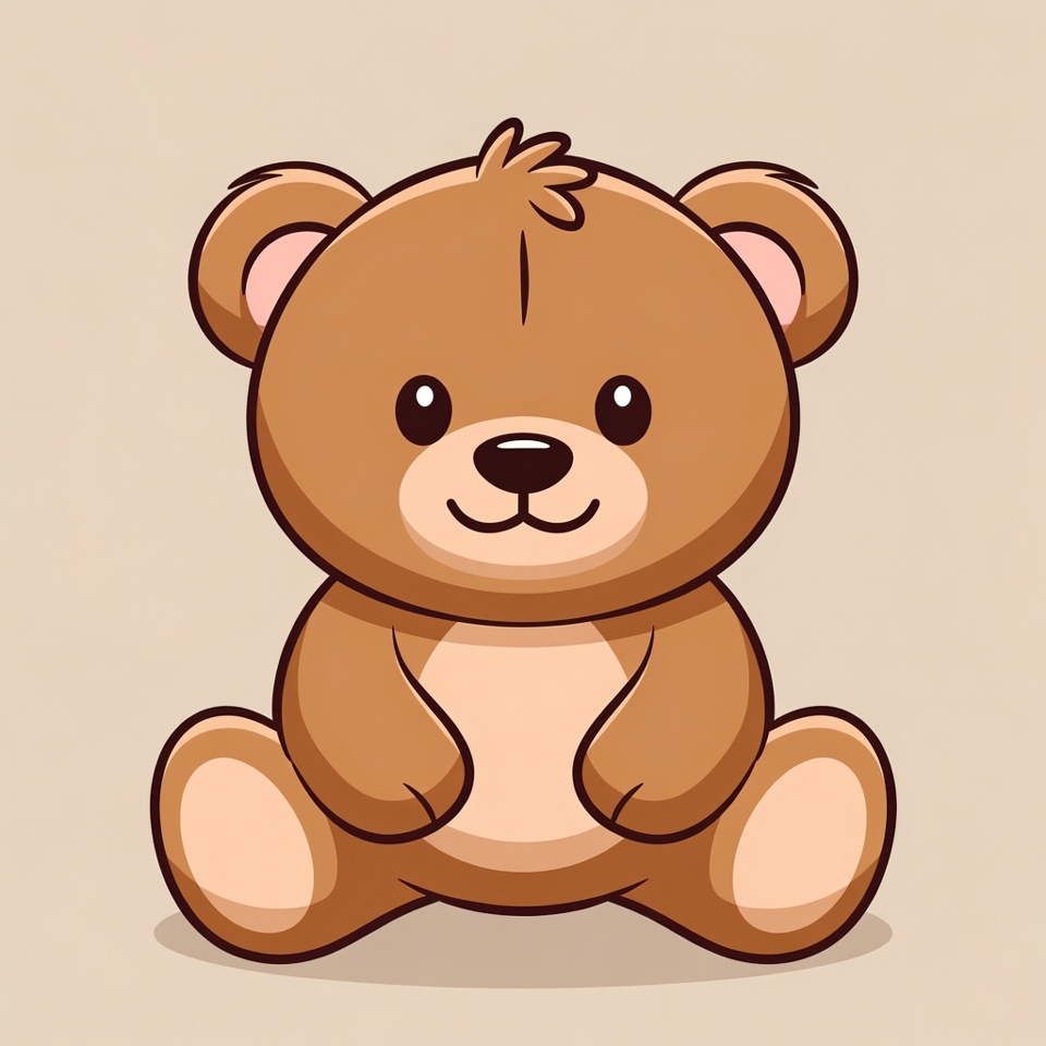 A cute brown teddy bear with big sparkling eyes sits on a plain beige background. The bear has a friendly smile, small ears, and chubby paws. It features a simple illustration style with clean outlines and soft shading.