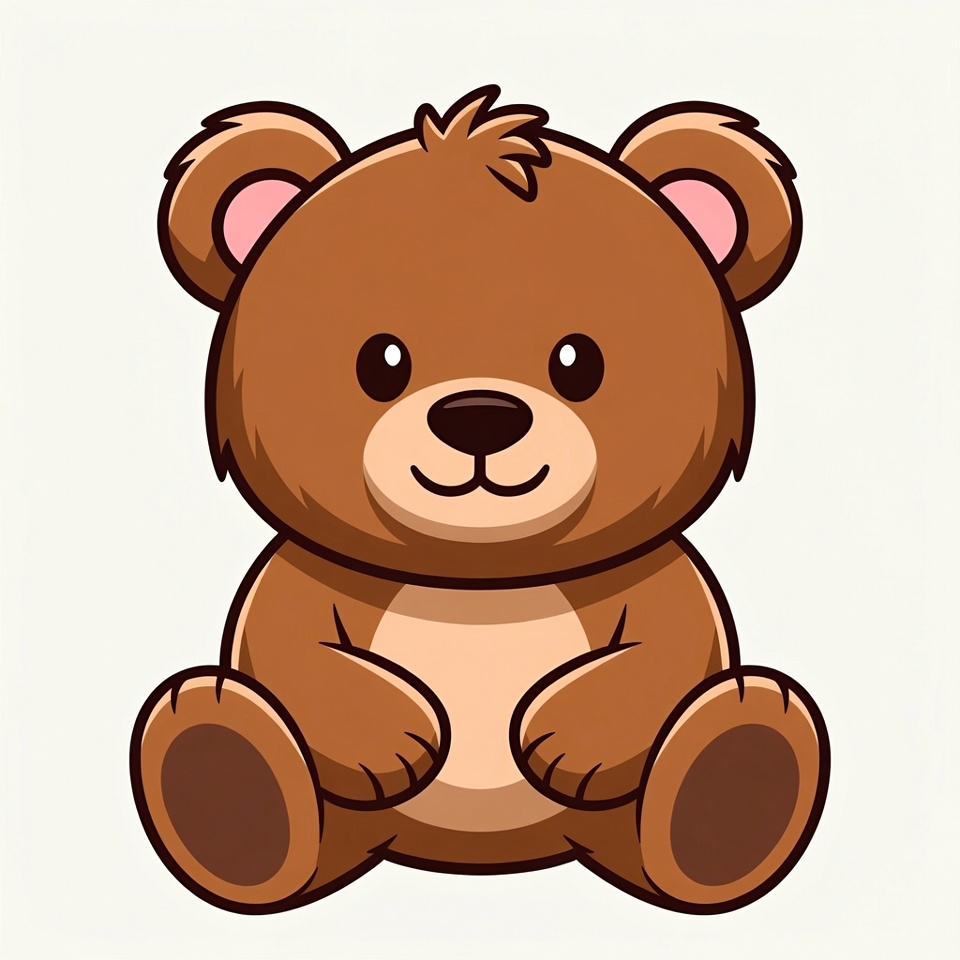 A cute brown teddy bear sits with its legs extended on a white background. The bear has big sparkling eyes, a small smiling mouth, and fluffy fur texture. It features pink inner ears and paw pads in a vibrant cartoon illustration style.