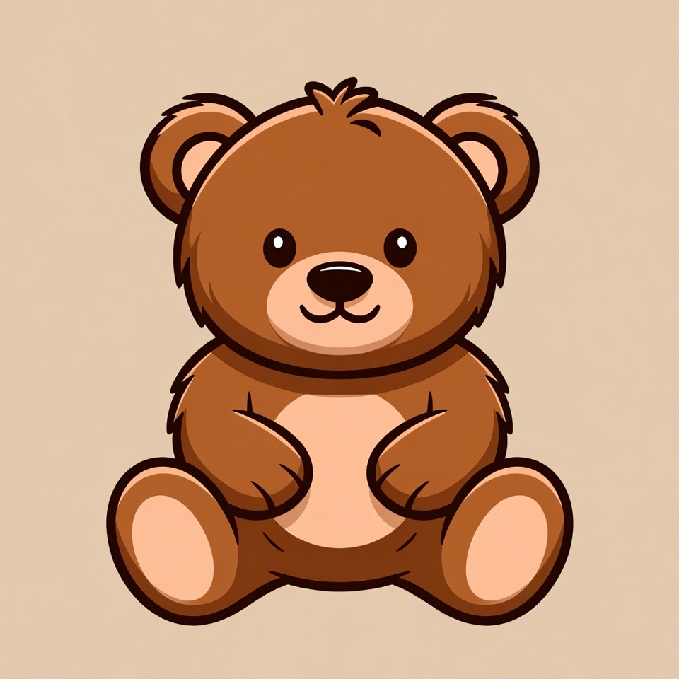 A cute brown teddy bear sits with a friendly smile on a plain beige background. The illustration features big sparkling eyes, small rounded ears, and fluffy fur texture. Its paws rest gently on its belly in a sitting pose.