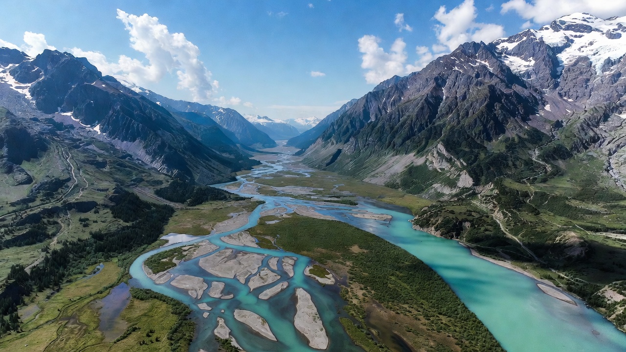 alpine landscape, blue sky, braided river, clear water, clouds, drone photo, glacial valley, glacier river, green meadows, high altitude, lush greenery, mountain range, mountain valley, mountains, nature, outdoors, peak scenery, river bend, river canyon, rocky terrain, scenic vista, sediment bars, snow-capped peaks, turquoise river, valley, valley floor, wilderness, aerial view