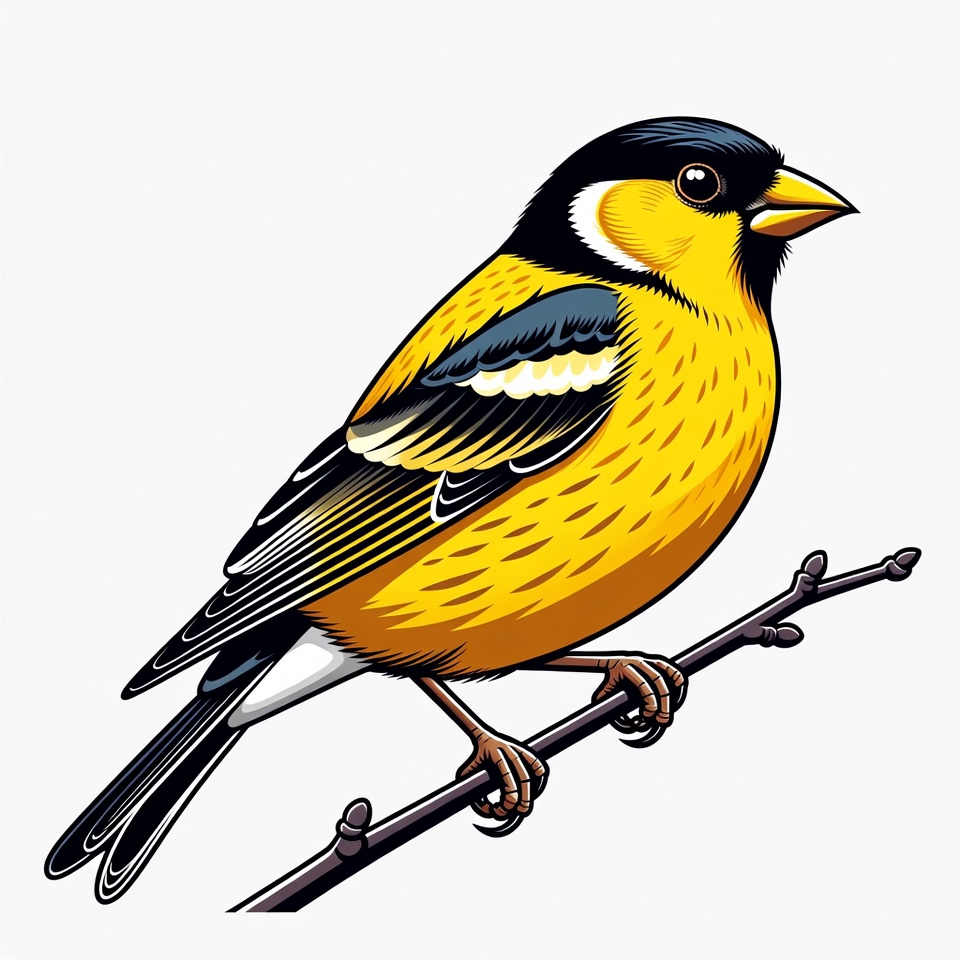 A vibrant goldfinch with yellow body, black cap, and white wing markings perches on a thin branch. Its black wings feature yellow and white accents, and it has a bright yellow beak. The illustration is set against a white background.