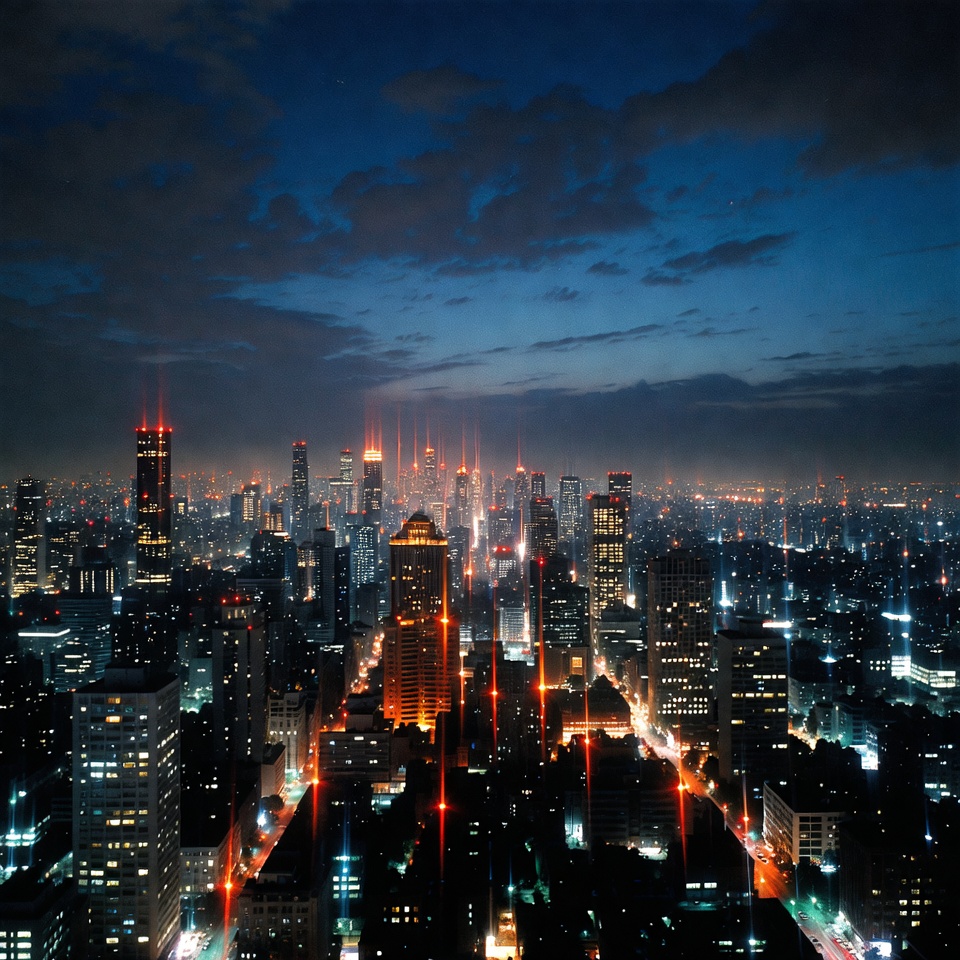 aerial view, architecture, buildings, city lights, cityscape, dark clouds, downtown, evening city, glowing buildings, high-rises, illuminated city, metropolis, night city, night lights, orange glow, red lights, skyscrapers, twilight skyline, urban landscape, city skyline