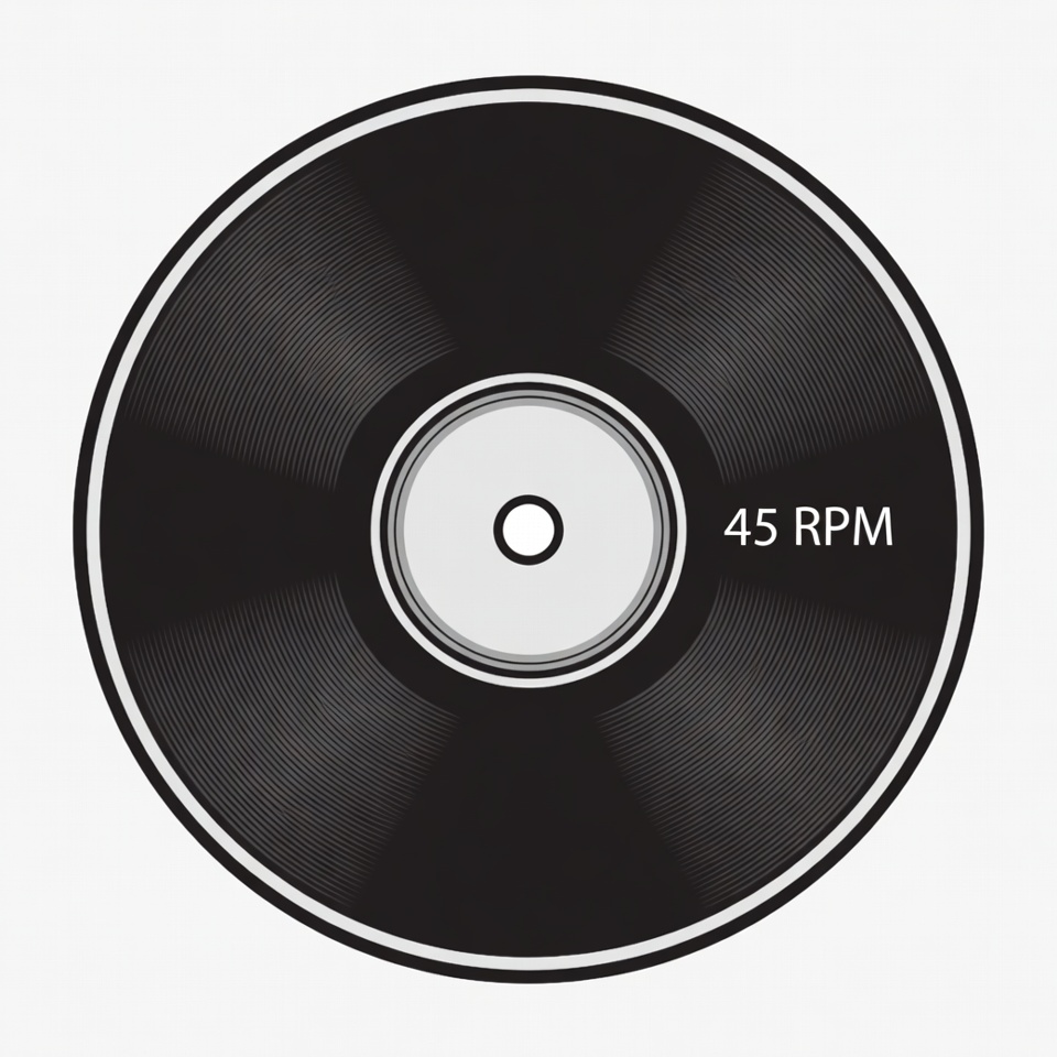 A black vinyl record with a white label marked 45 RPM sits centered on a plain background. The record features a glossy black surface with subtle grooves and a central spindle hole. The label displays bold '45 RPM' text.