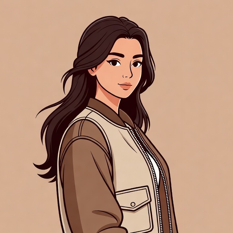 A young Asian woman with long wavy black hair stands in three-quarter view against a beige background. She wears a stylish beige zip-up vest with pockets and has a calm expression. The image is a colorful digital illustration.