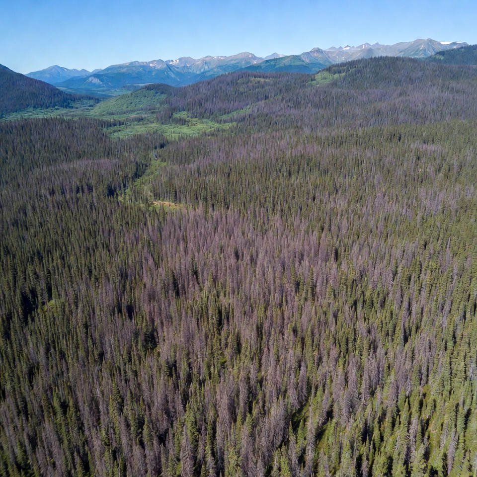 autumn forest, blue sky, coniferous trees, drone photo, evergreen forest, foliage, forest, green patches, high altitude, hills, landscape, mountains, nature, outdoors, panoramic, purple trees, ridge, rocky mountains, scenic, snowy peaks, terrain, valleys, vista, wilderness, woodland, aerial view