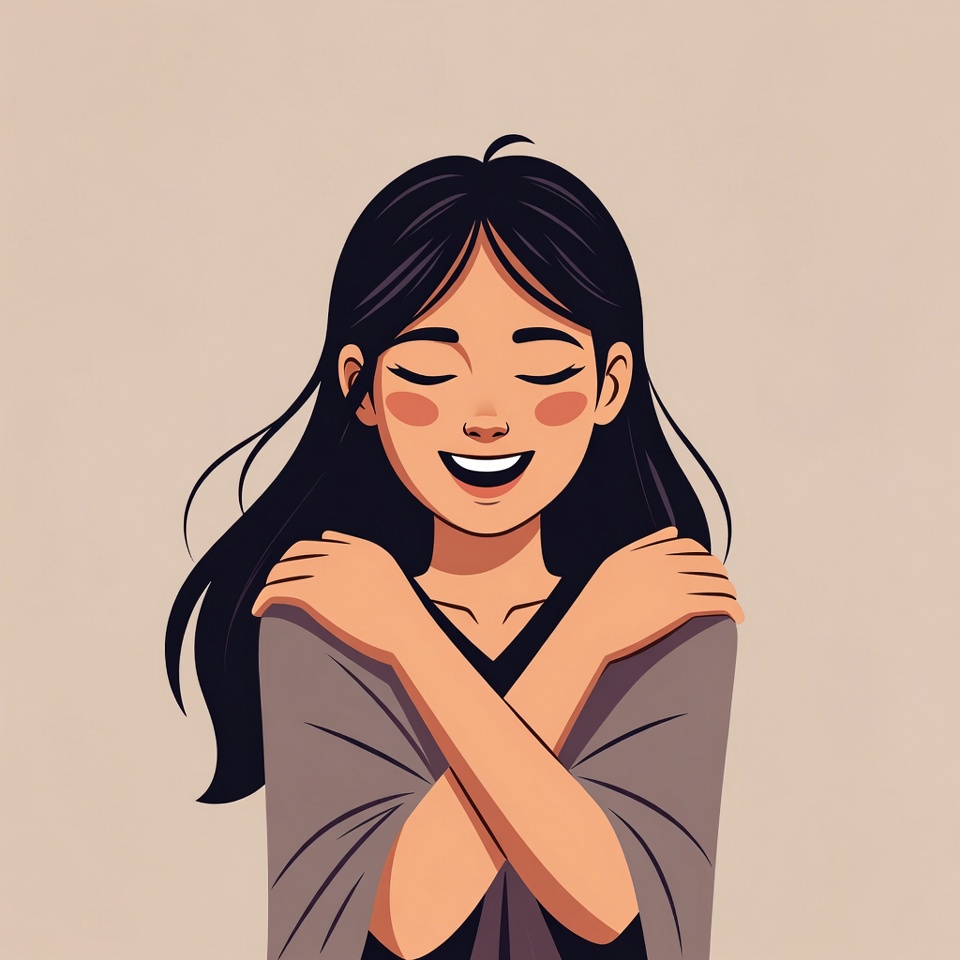 A digital illustration depicts an Asian woman with long dark hair and a joyful smile, hugging herself with crossed arms. She wears a gray top and has rosy cheeks, set against a plain beige background. Her hair flows softly around her serene face.
