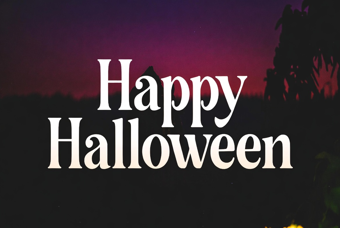 Halloween, Halloween banner, Halloween graphic, Halloween text, clipart, dark background, festive greeting, holiday graphic, illustration, isolated background, mysterious, orange glow, palm trees, purple background, shadows, spooky background, white text, Happy Halloween