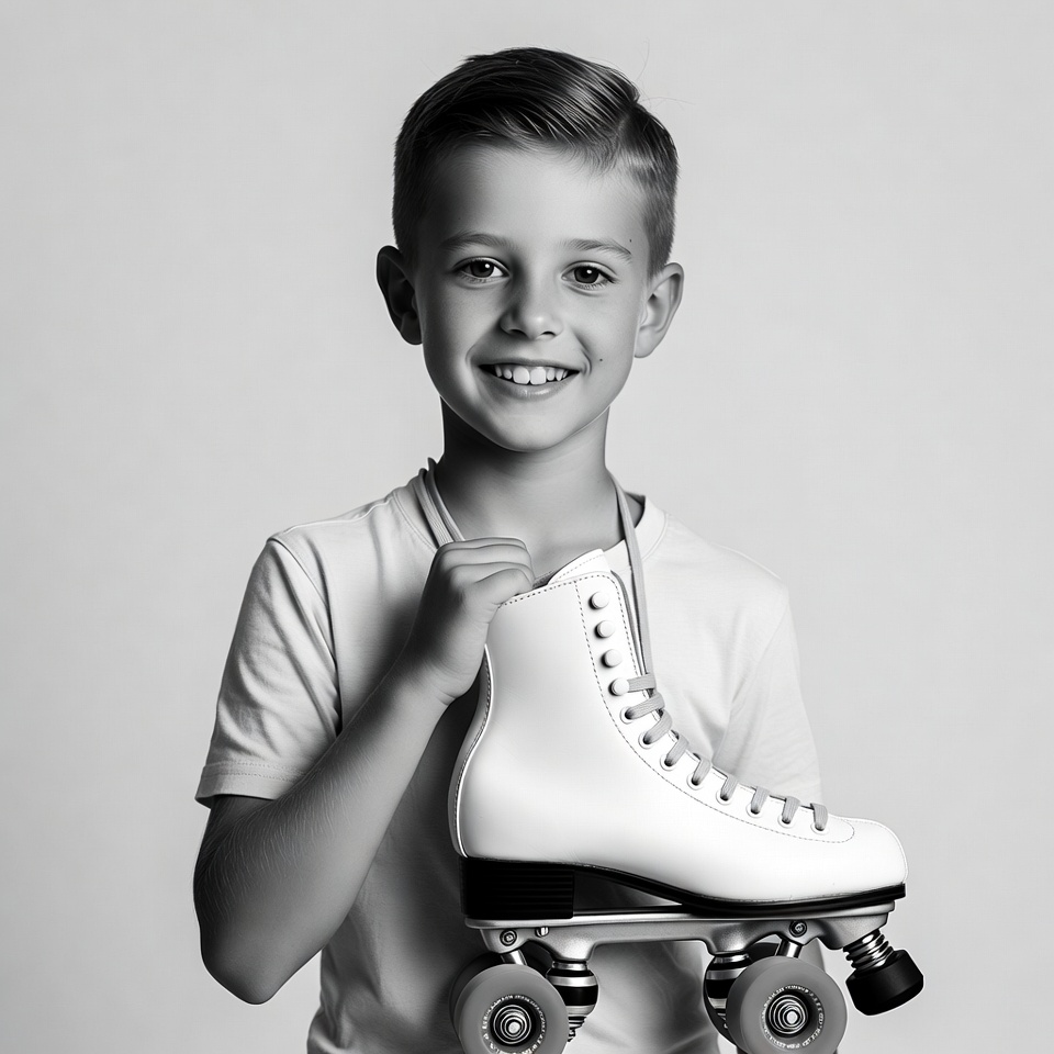A young boy with short light hair smiles at the camera while holding a pair of white roller skates in his hands. He wears a plain t-shirt and stands against a white background. The image is in black and white.