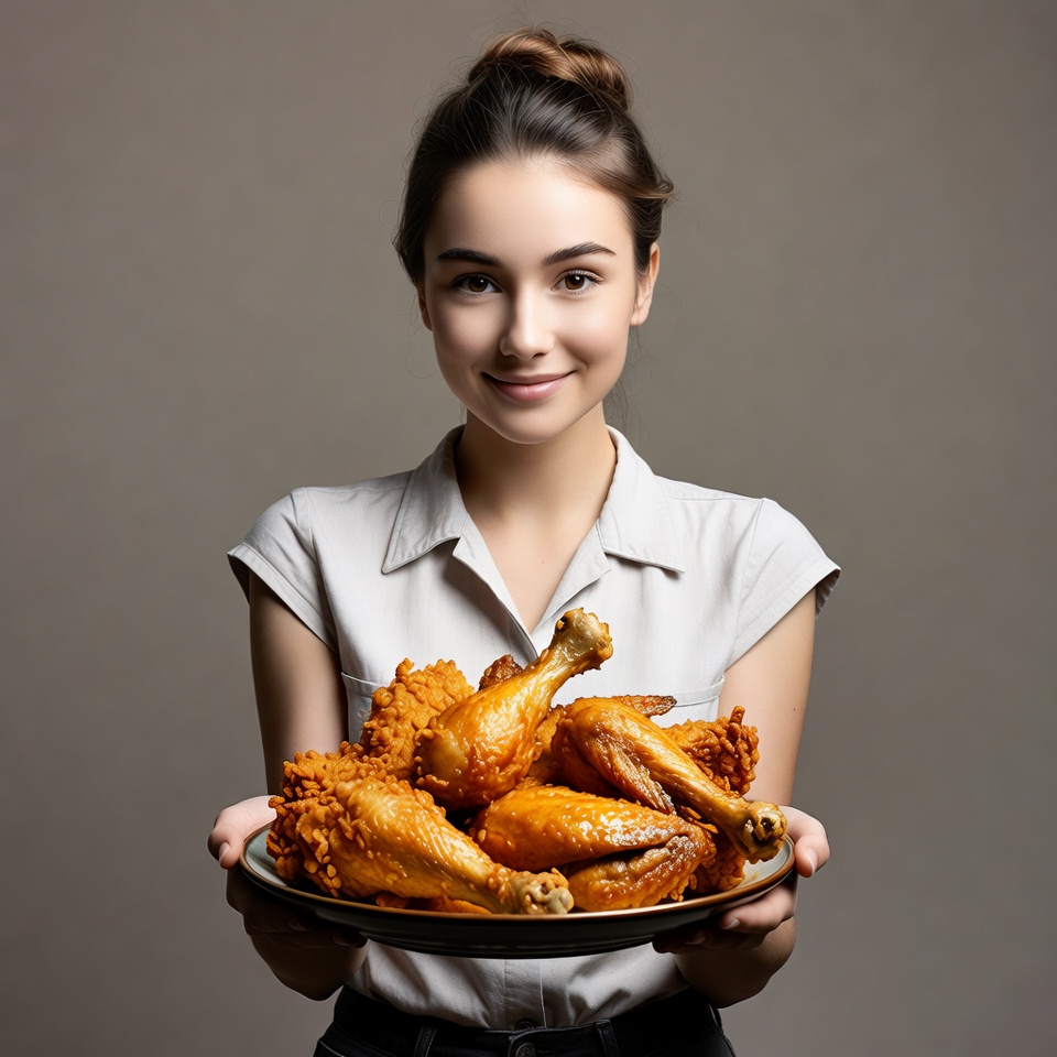 A young woman with brown hair in a bun smiles while holding a large platter of golden fried chicken drumsticks. She wears a white short-sleeved shirt and dark pants, standing against a plain gray background. The chicken is crispy and glistening with sauce on a white plate.