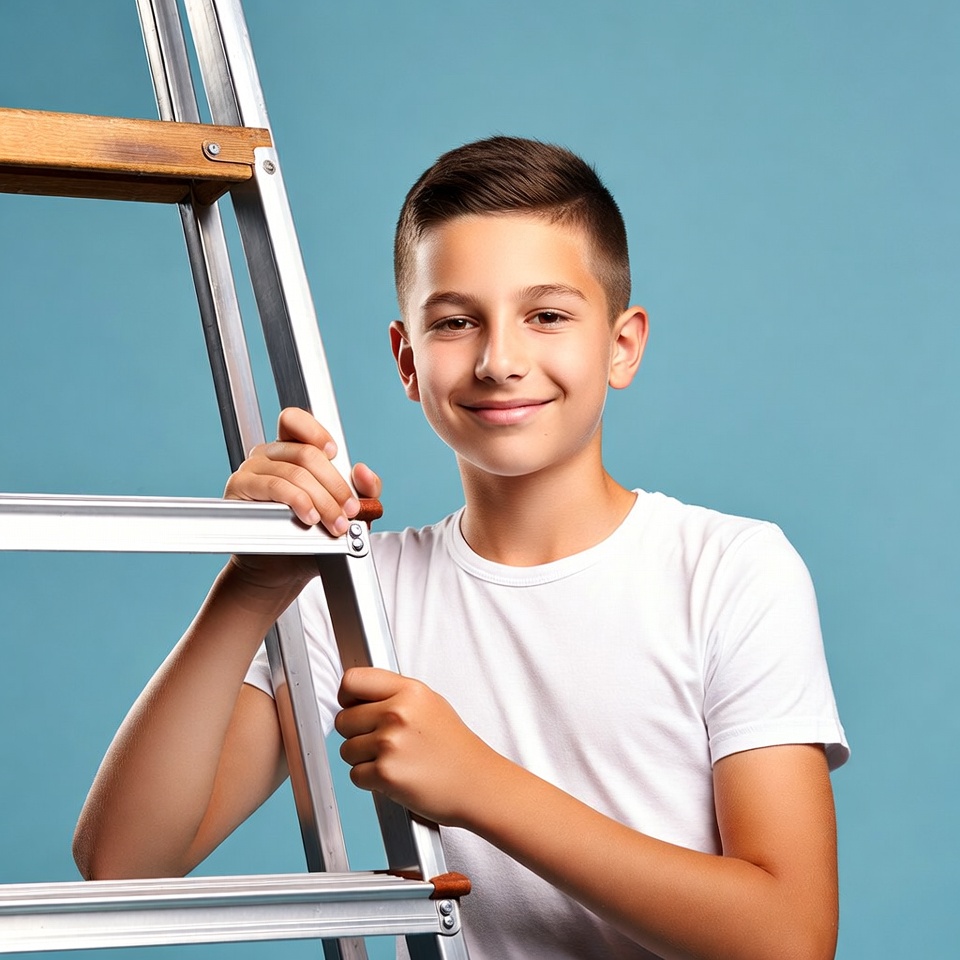 A young boy with short brown hair smiles while leaning on a wooden-topped metal ladder. He wears a white t-shirt and grips the ladder with both hands. The background is solid blue.