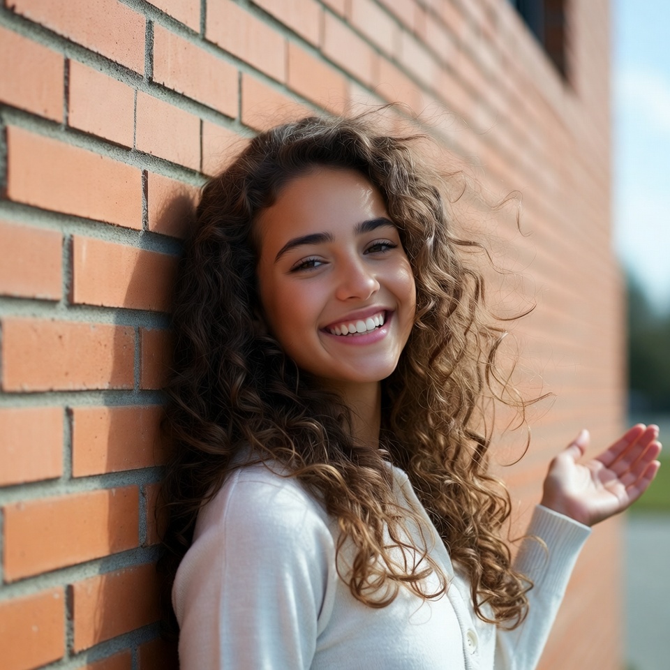 A young woman with long curly brown hair smiles happily while leaning against a red brick wall. She wears a white button-up shirt and raises one hand in a gentle wave. The background features a clear blue sky.