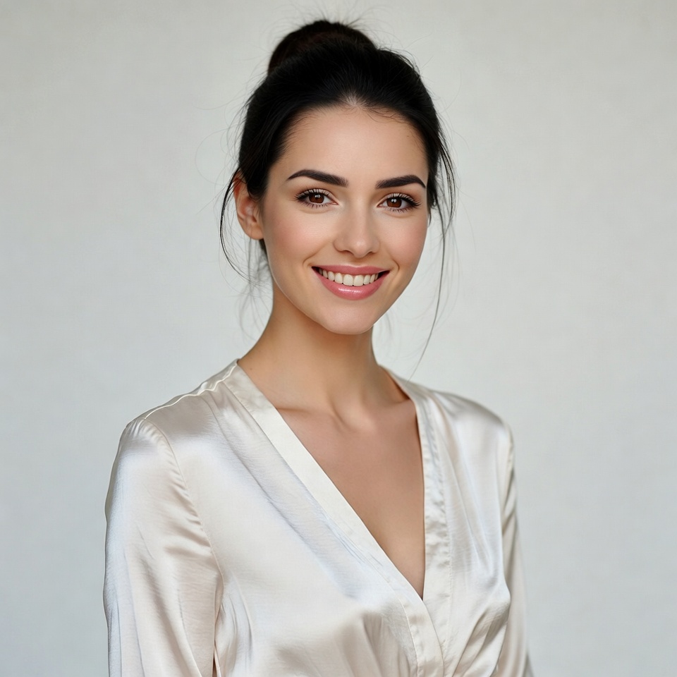A young woman with dark hair styled in a loose bun smiles warmly at the camera. She wears a shiny white silk blouse with a deep V-neckline. She stands against a plain white background.