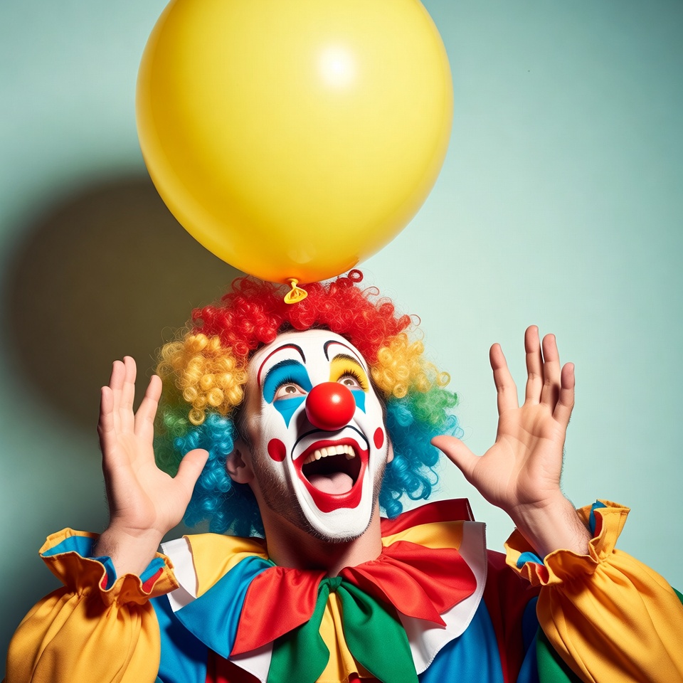 White, blue background, circus, costume, excited, hands raised, illustration, makeup, male, multicolored outfit, performer, red hair, red nose, ruffled collar, white makeup, yellow balloon, clown