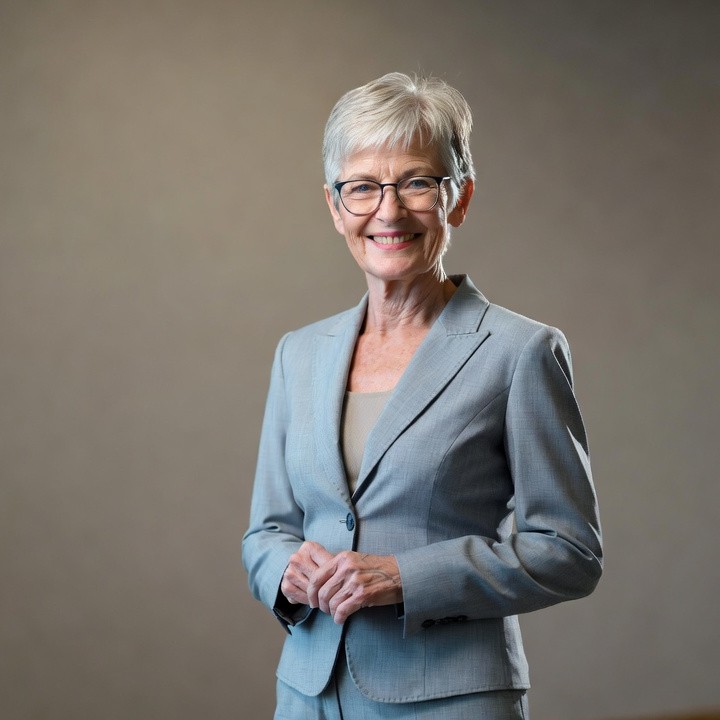 An elderly White woman with short gray hair and glasses smiles warmly at the camera. She wears a light gray suit jacket over a white top and stands with hands clasped in front. The image features a neutral beige background.