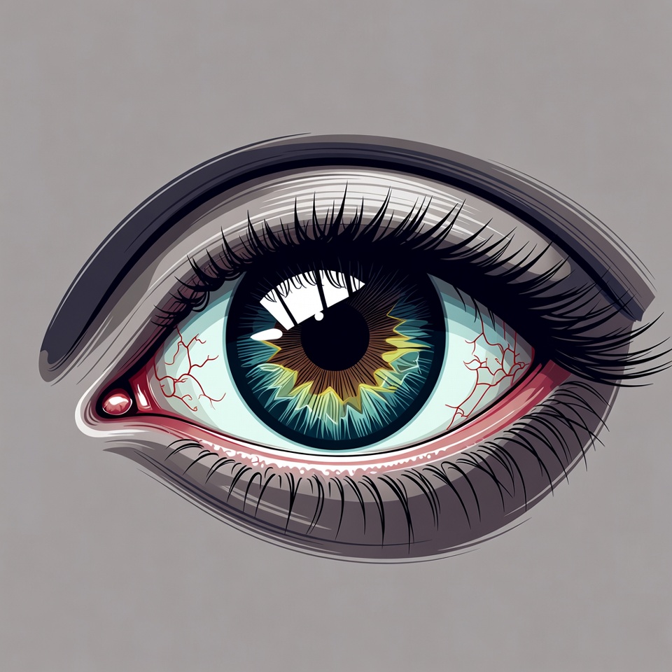 A close-up digital illustration of a human eye with a vibrant blue iris featuring a central brown starburst pattern. The eye has thick black eyelashes, visible red blood vessels in the white sclera, and subtle reflections on the cornea. It is set against a plain gray background.